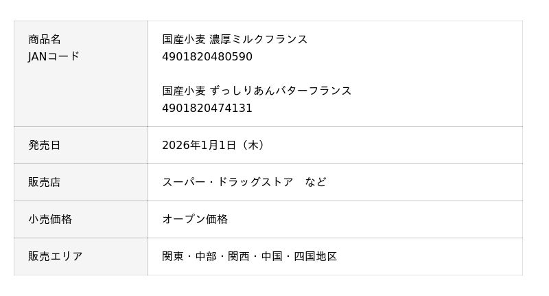 敷島製パン株式会社(Pasco)は、「ArtisanSelection」シリーズの新商品「国産小麦 濃厚ミルクフランス」を、2026年1月1日(木)より関東、中部、関西、中国、四国地区にて期間限定で発売します。