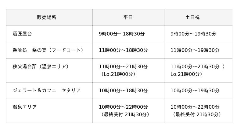 ※温泉エリア・秩父湯台所は別途入場料金がかかります。