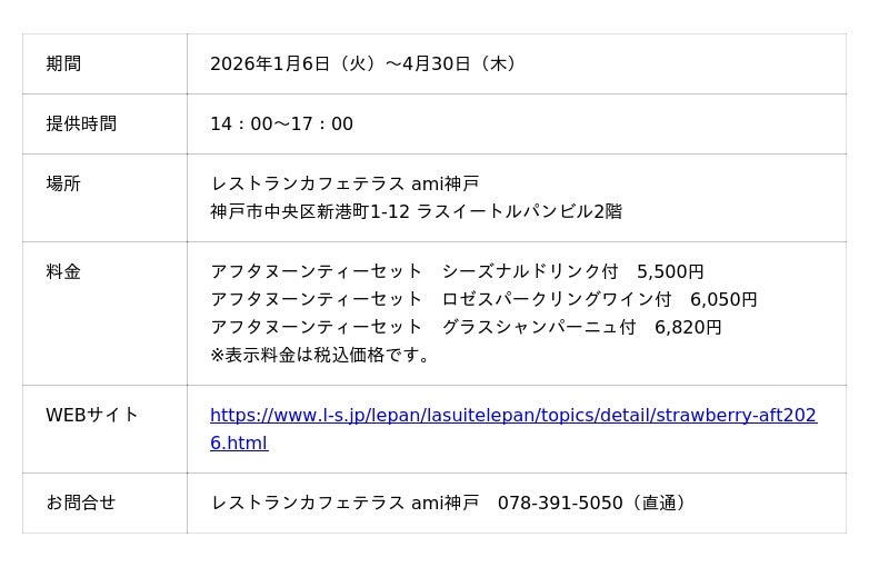 「ラスイートルパンビル」の2階にある「レストランカフェテラス ami神戸(料理長:笠原 鉄平、所在地:神戸市中央区)」で、2026年1月6日からストロベリーアフタヌーンティーを販売いたします。