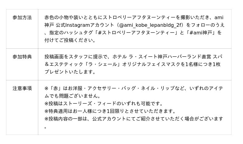 また、期間中に参加者全員にプレゼントをご用意したInstagramフォトキャンペーンを開催いたします。ストロベリーアフタヌーンティーの魅力を、お客さまが撮影された写真を通してもお愉しみいただける参加型企画です。
