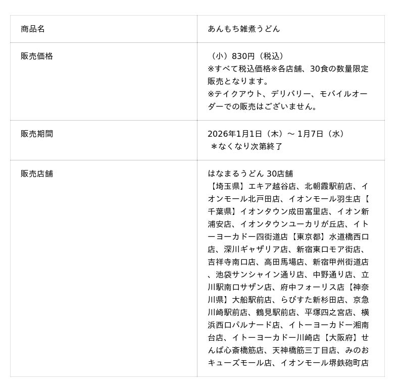 讃岐うどんチェーン「はなまるうどん」を展開する株式会社はなまる(本社:香川県高松市、代表取締役社長:前田良博)は、香川の老舗「イヅツみそ」「やこや」と初コラボレーションとなる『あんもち雑煮うどん』を、2026年1月1日(木)から1月7日(水)まで(*なくなり次第終了)の7日間、はなまるうどんの30店舗にて数量限定で販売いたします。