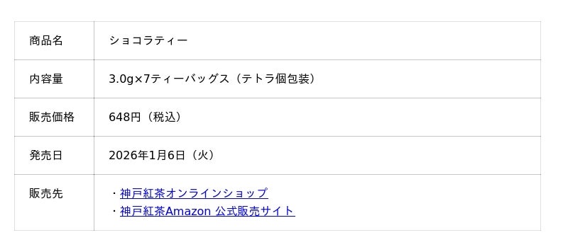 神戸紅茶株式会社(本社:兵庫県神戸市東灘区住吉浜町、社長:丸山 輝真)は、2026年1月6日(火)より、バレンタインティー「ショコラティー」を神戸紅茶オンラインショップにて数量限定で販売を開始します。