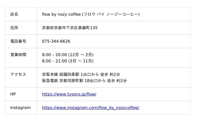 シングルオリジンコーヒーを専門に取り扱うNOZY COFFEEは、京都四条河原町にてコーヒーショップ「flow by nozy coffee (フロウ バイ ノージーコーヒー)」を2026年1月7日(水)にオープンいたします。高瀬川の桜並木と四季折々の表情を見せる鴨川に挟まれた京町家をモダンに改装した空間で、NOZY COFFEEの高品質なシングルオリジンを堪能できるカフェメニューのほか、コーヒーの魅力を生かしたカクテルやクラフトビールも提供します。朝から夜まで日常に寄り添う多様なコーヒーの楽しみ方を提案し、人や文化が自然と交わるコミュニティの拠点を目指します。