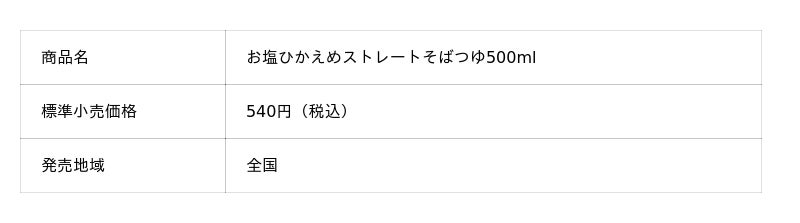 本商品は、レギュラータイプの「ストレートそばつゆ500ml」(姉妹品)のおいしさはそのままに、塩分を30%(※2)カットしています。国内製造のだし原料をより多く使用(※3)することで、そばに合う芳醇なだしの風味とうま味をお楽しみいただけます。