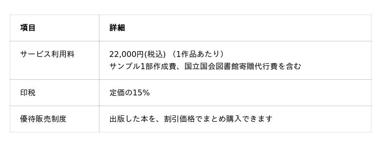 サービス利用料は22,000円(税込)と低価格に設定しました。ご自身で完成原稿をご用意いただける場合、これ以外の出版費用はかかりません。また、印税は設定した定価の15%と、著者の収益性を重視した設定です。