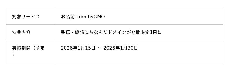 今回の優勝と日頃のご支援への感謝の気持ちを込めて、GMOインターネットグループ各社にて、ニューイヤー駅伝 初優勝「応援ありがとうキャンペーン」を開催いたします。