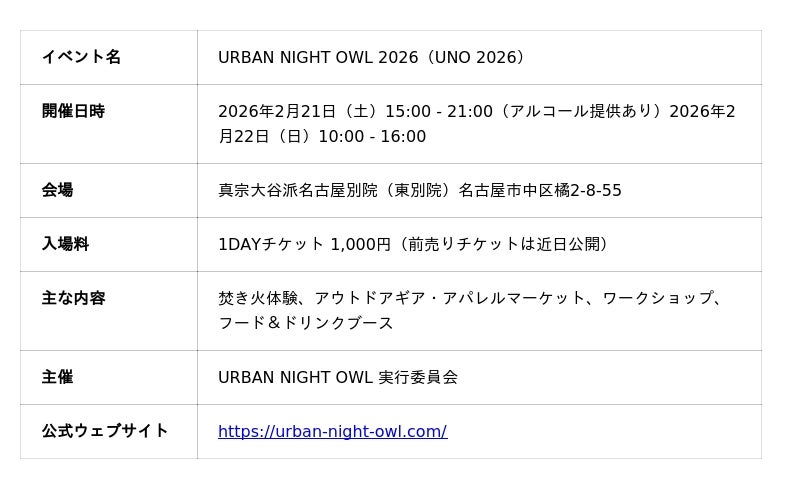 URBAN NIGHT OWL 実行委員会(代表:尾関良祐)は、2026年2月21日(土)・22日(日)の2日間、真宗大谷派名古屋別院(東別院)にて、都市型アウトドアイベント「URBAN NIGHT OWL 2026(以下、UNO)」を開催いたします。