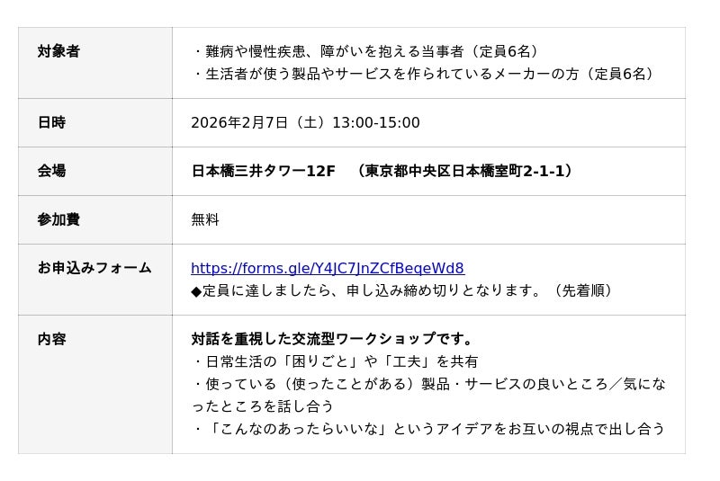 〈だれかのイイは、みんなのイイ〉難病や障がいを抱える当事者と開発者の交流型ワークショップを2026年2月8日に日本橋で開催!インクルーシブデザインの第一歩として 参加者募集【各定員6名】先着順