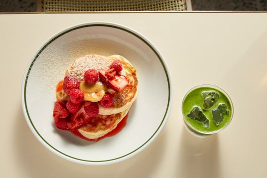 【bills 横浜赤レンガ倉庫限定】自家製ストロベリーとレモングラスのジャムの甘酸っぱさと、クコの実を合わせたきな粉バターが絶妙なバランスのパンケーキです。