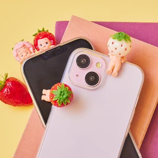 ちょこんと顔を出す姿が可愛らしい、ぶら下がり苺キューピーちゃん。スマホなど好きなところに貼って、日常のささやかな癒しに。