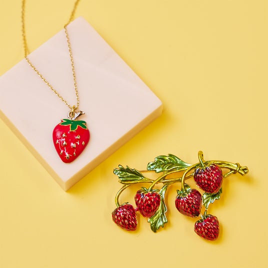 いちごの形のアクセサリーが、季節の装いに可愛いアクセントを添えます。