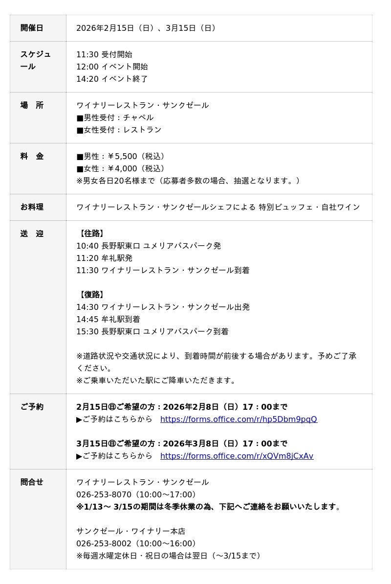 株式会社サンクゼール(本社:長野県飯綱町/代表取締役社長:久世良太)は、2月と3月に、飯綱町社会福祉協議会との共催により婚活パーティを開催します。