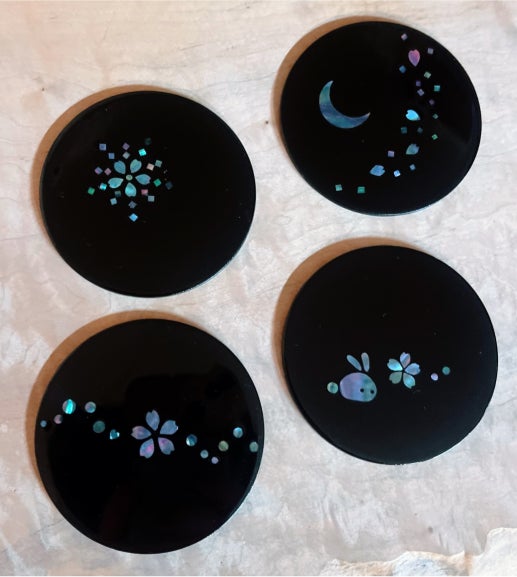 コースターに塗りこまれた貝を研ぎ出す体験。天然の螺鈿の美しい輝きをお楽しみいただけます。