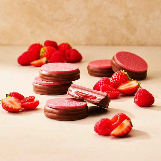 艶やかにとろけるラズベリーキャラメルとホワイトチョコレートをストロベリークッキーでサンドし、ミルクチョコレートで包み込みました。ブランドロゴが印象的な2種のベリーを合わせたチョコレートプレートを重ねて、深く上品な余韻を残す特別なスイーツに仕立てました。