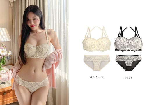華やかなフラワーパターンにレースをレイヤードして、爽やかでキュートなデザインのブラセットです。ストラップレスでの着用も可能で、オフショル用のブラとしても活用できます。快適さ・ボリューム・デザインのすべてが優れたアイテムです。