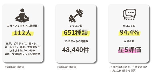 オンラインヨガ・フィットネス・スポーツレッスンへの約2,000件の口コミで96%が満点の星5を投稿