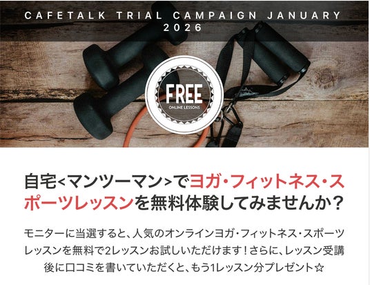 世界92カ国以上の講師と140カ国以上の生徒をつなぐ日本最大級オンライン習い事サイト「カフェトーク(https://cafetalk.com/ )」を運営する株式会社スモールブリッジ(本社:東京都渋谷区、代表取締役:橋爪小太郎)は、2026年1月、ヨガ・フィットネスカテゴリを対象とした「特大モニターキャンペーン」を実施いたします。