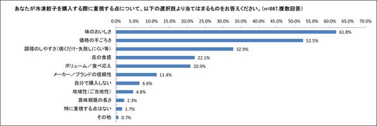 2、冷凍餃子を購入する際に重視する点について、以下の選択肢より当てはまるものをお答えください。(n=867、複数回答)