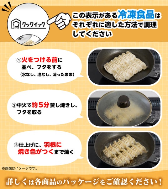 また、今回発売する餃子は「時短」と「ひと手間加えておいしい食事がしたい」という両方のお客様のニーズに応える『クックイック』シリーズのコンセプトに合い、工程は1.「フライパンに並べる」、2.「ふたをして中火で約5分焼く」、3.「仕上げに、羽に焼き色をつける」だけでの簡単調理で、おいしく召し上がれます。