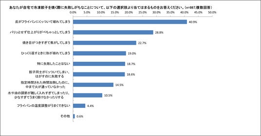 3、 自宅で冷凍餃子を焼く際に失敗しがちなことについて、以下の選択肢より当てはまるものをお答えください。(n=867、複数回答)