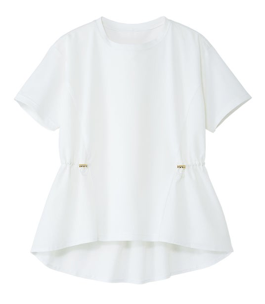 背中側は通気性と吸汗速乾、前身頃は吸水速乾に優れた素材を採用した、蒸し暑い季節でも風を通し、涼しく着こなせるアイテム。長めの後ろ丈と両サイドのドローストリングで、体型カバーにも。