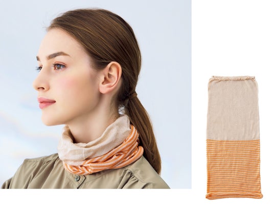 UVカット率93.1%以上で、首元を太陽光からも寒暖差からも守る通気性の良いシルク100%のネックガード。