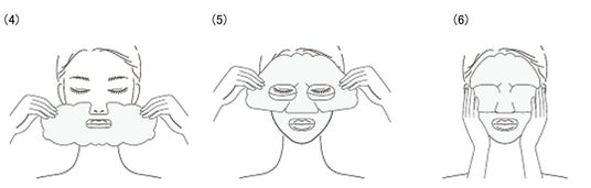 ● 下用のマスクを袋から取り出し、そっと広げて両端を持ち、口の位置を合わせます。フェースラインに沿って、こめかみに向かってフィットさせます。(イラスト(4))