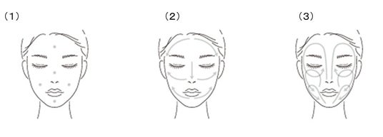 ● 目の中に入らないよう、やさしくていねいにのばし、ほおや額などの広い部分に大きく円を描くように指全体を使ってなじませます。小鼻など細かい部分は、指先で丁寧に行います。(イラスト(3))