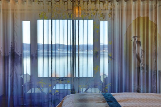 水墨画のレースカーテン越しに見える諏訪湖を絵画のように見立てた客室