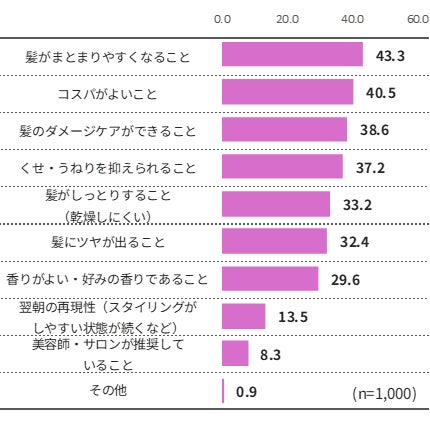 そんな朝の髪の仕上がりに悩む女性がインバスケア商品を選ぶ際に重視する点として最も多いのは「髪がまとまりやすくなること」(43.3%)という結果に。次いで「コスパがよいこと」(40.5%)、「髪のダメージケアができること」(38.6%)となりました【グラフ7】。