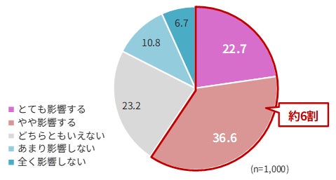 加えて、【朝、髪が「整っている」か「整っていない」か】が、自身の一日の気分にどの程度影響するか尋ねたところ(n=1,000)、約6割(59.3%)が影響すると回答【グラフ3】。