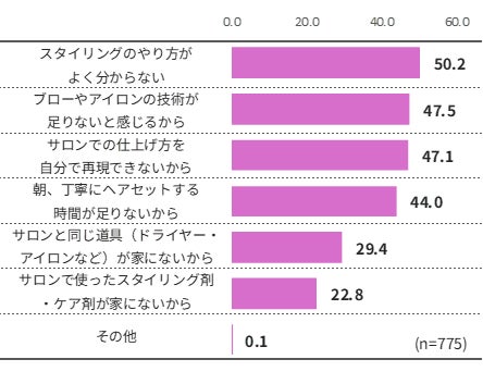 続いて、サロン帰りのような仕上がりを再現するのが難しい理由について尋ねたところ、「スタイリングのやり方がよく分からない」を理由に挙げる人が最も多い(50.2%)結果に。「朝、丁寧にヘアセットする時間が足りないから」を理由に挙げる人も約4割(44.0%)いることが分かりました【グラフ6】。