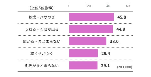 ・髪の悩みランキング 第一位「乾燥・パサつき」(45.8%)、第二位「うねる・くせが出る」(44.9%)第三位「広がる・まとまらない(38.0%)