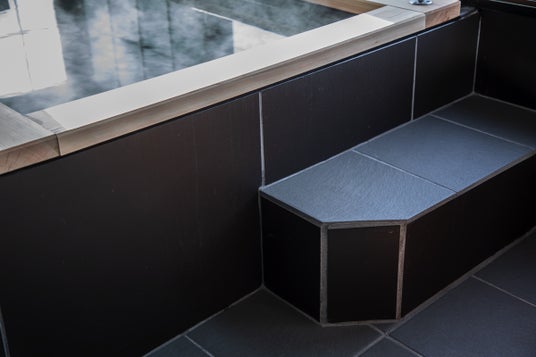 新たな客室露天風呂では、浴槽を檜から石造りへ変更し、浴槽周りの石畳化、手すり、ステップ(※ワイドタイプのみ)を新設。