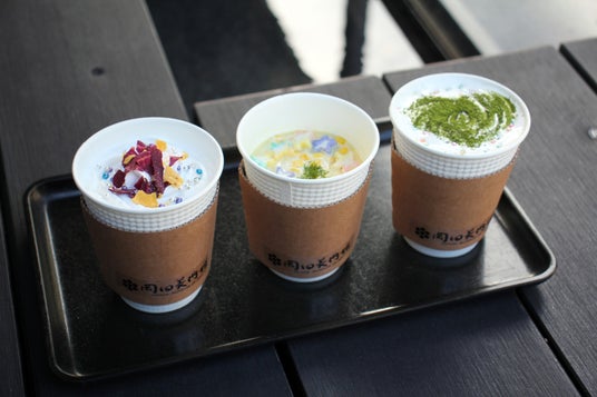 左から美古途:小豆薫る紫芋しるこ(おしるこ)・夕凪機:玉蜀黍和み黄金スープ(コーンスープ)・氷夏至:抹茶舞う翠ほのか(抹茶ラテ)