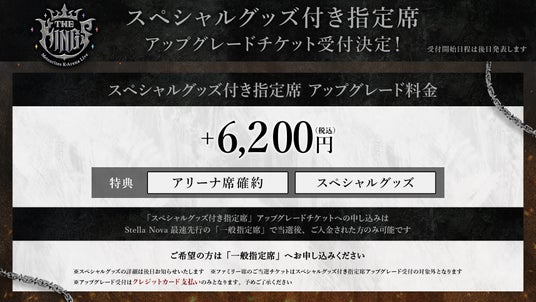 「スペシャルグッズ付き指定席」アップグレード チケット受付も決定!Stella Nova最速先行受付で「一般指定席」チケットを当選後、ご入金された方を対象に、「スペシャルグッズ付き指定席」へのお申込みを後日受け付け、抽選する方法です。当選された場合、「一般指定席」チケットはアップグレード料金として1枚につき6,200円(税込)+手数料をお支払いいただきます。