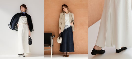 女性のためのシルエットを研究し続けてきたSOMETHINGならではの、ラインをきれいに見せる設計はそのままに、今回はベイカーストレートデニムとバックタックデニムスカートが完成。