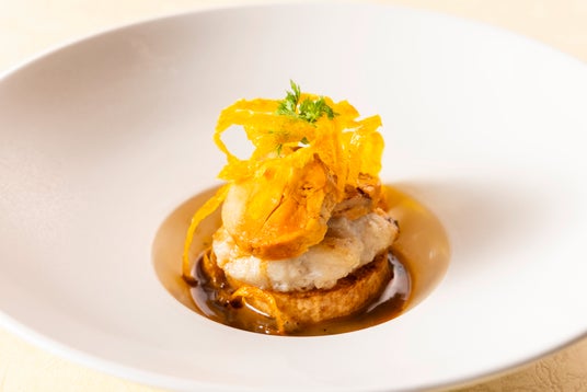 ・鮟鱇・あん肝・自然薯のアンサンブル 鹿児島壺造り黒酢と柚子のバターソース