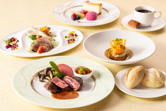 (一例:オニオンスープ、ワカサギと香味野菜のマリネ、ウニのフラン、高知県産『荒木さん家の鰤』低温調理 和の旨味と醤油香る春菊ピューレ、胡麻を纏ったハンガリー産マグレ鴨ロースなど)
