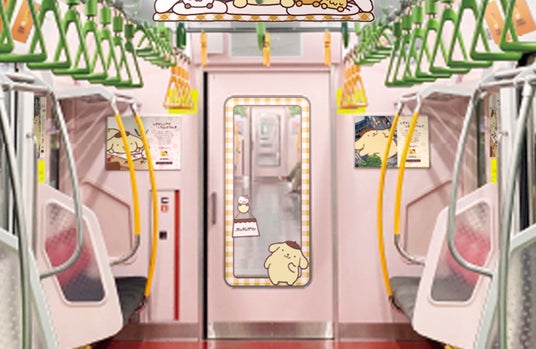 ラッピングトレインでは、車体のドア横にポムポムプリンのビジュアルをあしらうだけでなく、車内全体もポムポムプリン一色に。アニバーサリーイヤーのキーメッセージ「むずかしいこと、しらんぷりん♪」をテーマに、ポスター、アドストラップ(吊革広告) 、ドアガラスステッカーなどがポムポムプリンの特別デザイン仕様になり、トレインチャンネルではポムポムプリンの1日を描く約4分間の特別アニメーションを初公開いたします。ポムポムプリンと一緒に「ぼーっとのんびり」できるやさしい癒しの空間を体感いただけます。