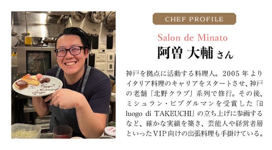 ディナーを担当するのは、神戸を拠点に活躍する料理人、阿曽大輔氏(Salon de Minato)。