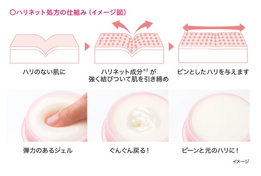 "乾燥小ジワ・ハリ不足・しぼみ感”など年齢とともに深刻になりやすい肌悩みに、美肌成分が集中アプローチ! 形状記憶ジェルの力で"10秒でピーン!”*¹とひと塗りでハリがよみがえる体感に導きます。