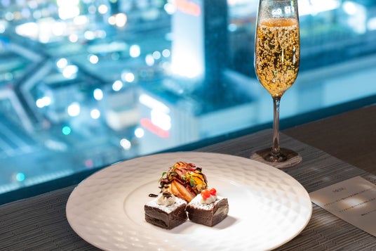 ホテル特製カカオプレートと客室から望む夜景