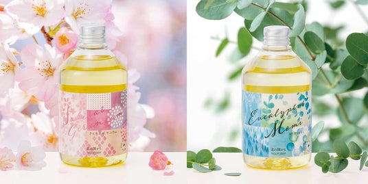 写真右より アロマバスエッセンス ユーカリとモミ 300mL 2,640円(税込)/ 約18回分 、アロマバスエッセンス さくらとゼラニウム 300mL 2,640円(税込) / 約18回分