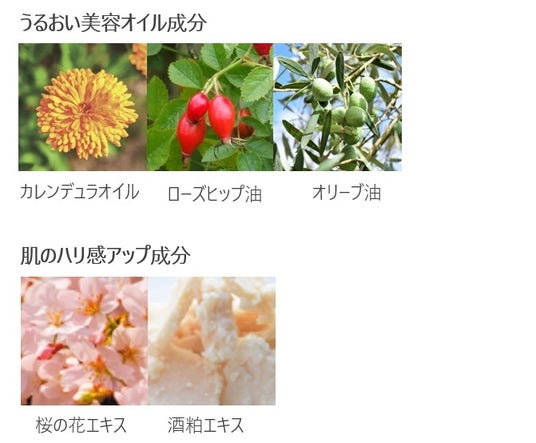 ●うるおい美容オイル成分 ・カレンデュラオイル(トウキンセンカ花エキス、オリーブ果実油 ) ・ローズヒップ油 ・オリーブ果実油 ●肌のハリ感アップ成分 ・桜の花エキス(サトザクラ花エキス) ・酒粕エキス