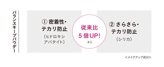 *1 紫外線吸収剤不使用 *2 保湿・整肌成分 *3 乾燥によるもの *4 紫外線などによる肌荒れを防ぐこと *5 バランスキープパウダー(ヒドロキシアパタイト、シリカ)としての配合量が従来品比5倍