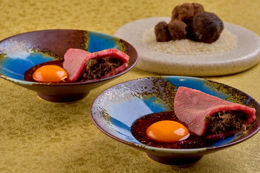 2. 最上級の体験を約束する「特選和牛×トリュフ」 贅沢を極めるお客様には、最高級和牛を使用したコースをご用意。焼物のスペシャリテ「特選和牛ヒレの焼きすき ~トリュフ、濃厚卵黄~」は、口の中でとろけるヒレ肉とトリュフの香りが重なる、正に「至高」の味わいです。