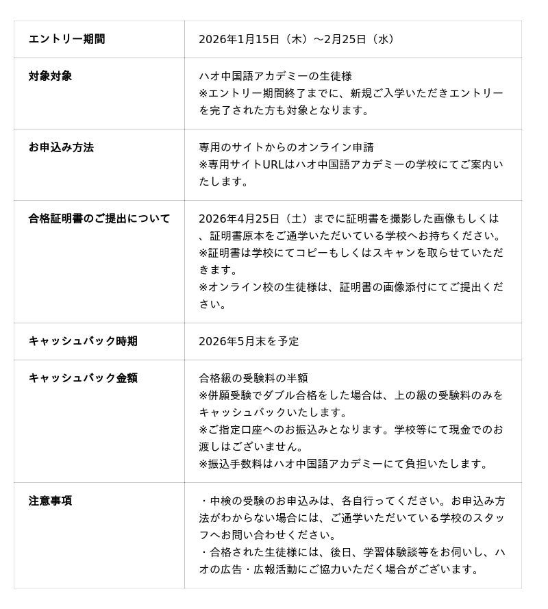 本企画は、ハオ中国語アカデミーにご通学いただいている生徒様で、2026年3月22日に実施される中国語検定(以下「中検」)に合格された方を対象に、合格した級の受験料の半額をキャッシュバックいたします。