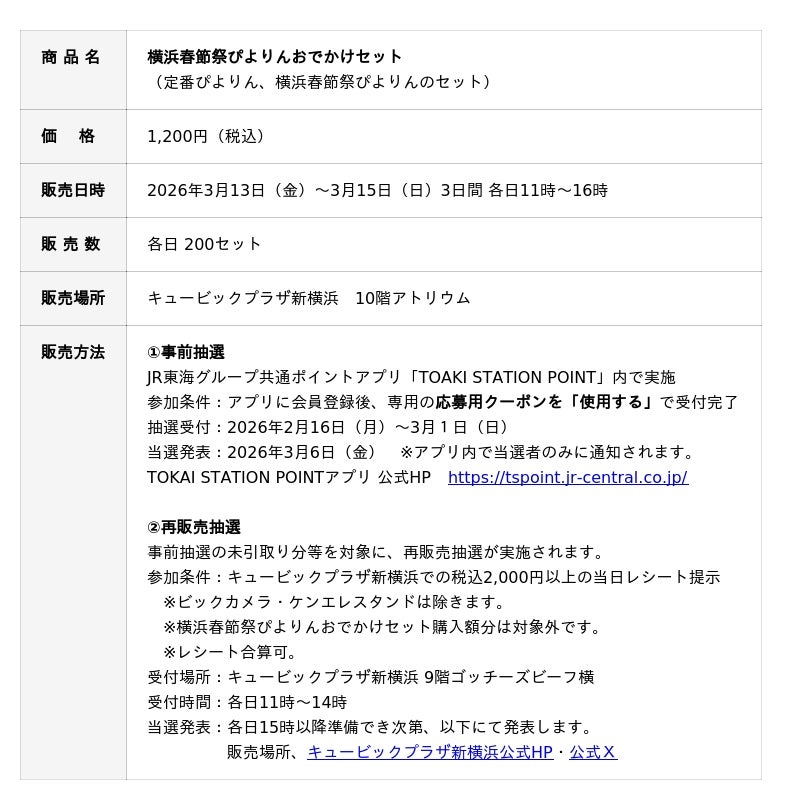 ジェイアール東海フードサービス株式会社(本社:愛知県名古屋市、代表取締役社長:岩下賢一)のオリジナルスイーツ「ぴよりん」の誕生15周年を記念し、JR新横浜駅直結の商業施設「キュービックプラザ新横浜(運営:新横浜ステーション開発株式会社、代表取締役社長:松尾 啓史)」にて、2026年3月13日(金)から15日(日)までの3日間限定で、神奈川県初の限定ぴよりん「横浜春節祭ぴよりん」を販売いたします。