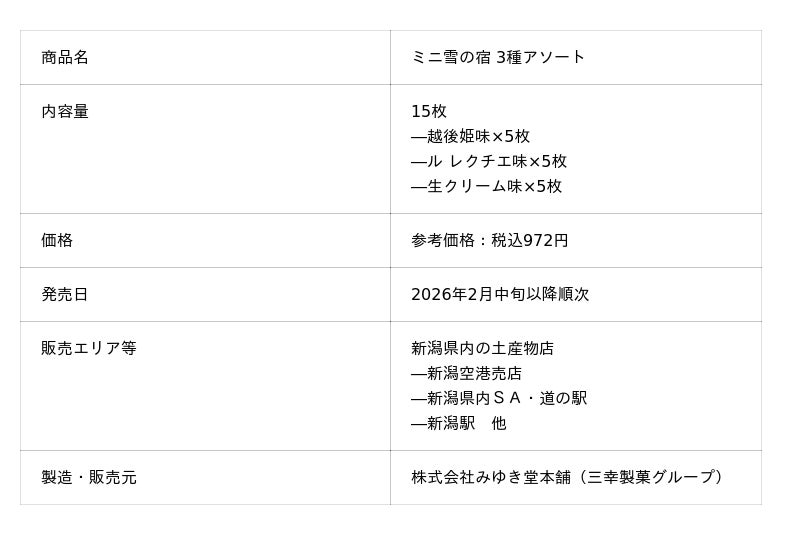 三幸製菓グループの株式会社みゆき堂本舗(所在地:新潟市北区)は、三幸製菓株式会社のロングセラーブランド「雪の宿」から、新潟県の特産品のフレーバーを再現したお土産向け商品「ミニ雪の宿 3種アソート」を新潟県内限定で2026年2月中旬より発売いたします。